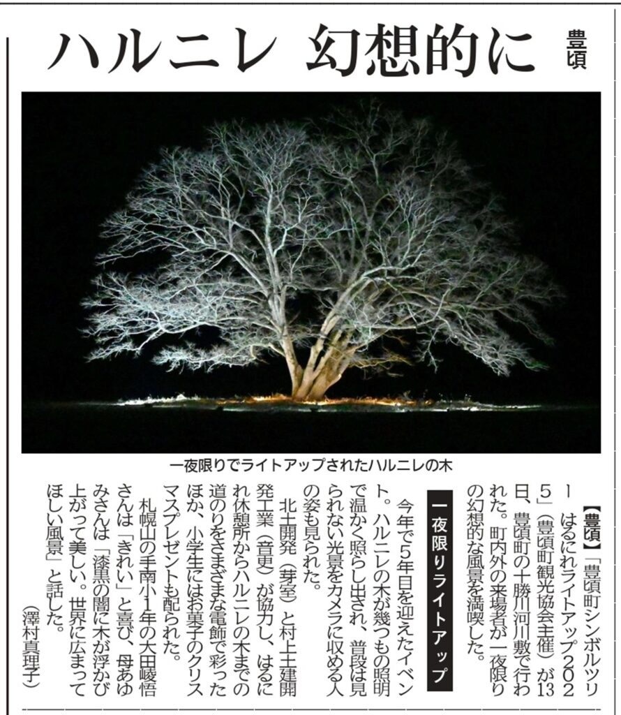令和7年12月13日(土)17時~20時30分の間に開催された、豊頃町シンボルツリーはるにれライトアップ2025(町観光協会主催)に、